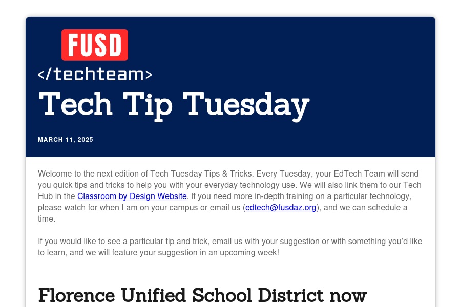 Tech Tip Tuesday January 21, 2025 Welcome to the next edition of Tech Tuesday Tips & Tricks. Every Tuesday, your EdTech Team will send you. . .